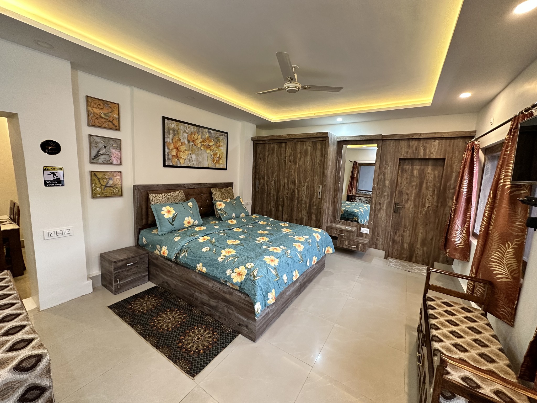 Representing the pinnacle of comfort at Serenya Homestay, the Jacana Suite is a sanctuary of luxury and convenience. It houses a lavish king-size bed, ample wardrobe space, and a well-appointed bathroom. The cozy living room features a dining table, a sofa that transforms into a bed for two, a pantry, and a door that unfolds onto a breathtaking view. For your viewing pleasure, the suite is outfitted with a TV, providing access to Netflix, Amazon Prime, and Hotstar accounts. Immerse yourself in the sumptuous confines of the Jacana Suite.